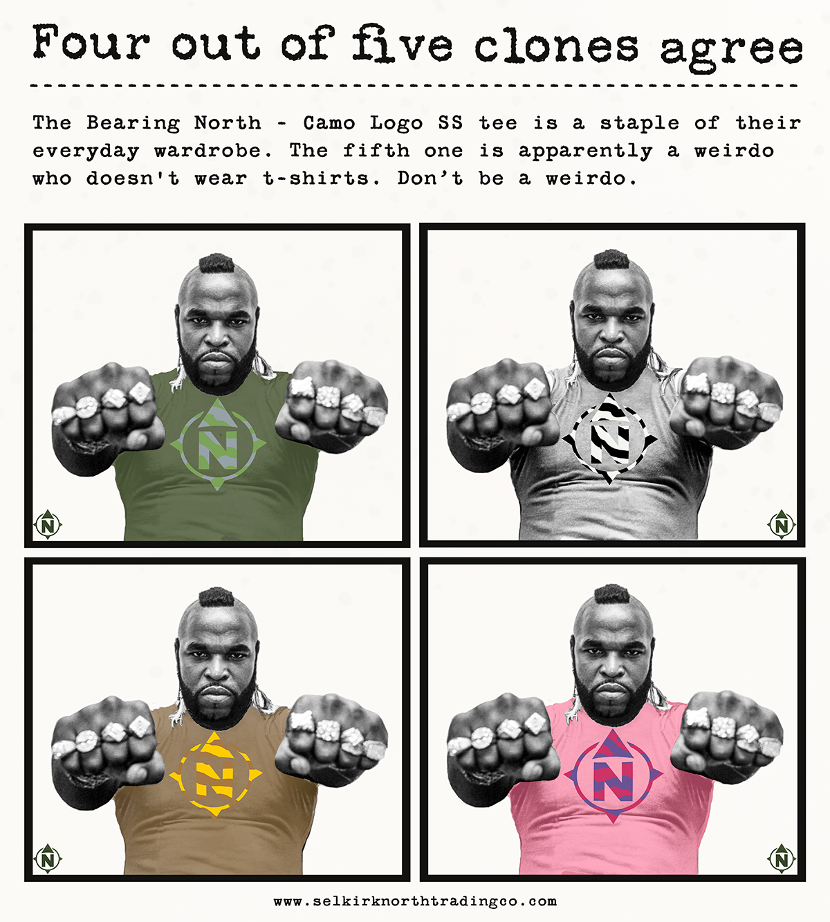 Be sure that your wardrobe is dialed in and always fresh. Check out our collection of Bearing North - Camo Logo short-sleeve tees. There are four different color and camo combos to choose from. That makes four days of the week an easy "what to wear" decision.