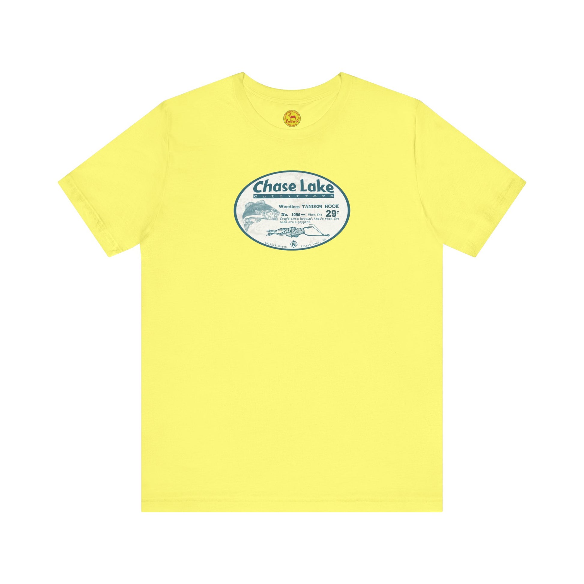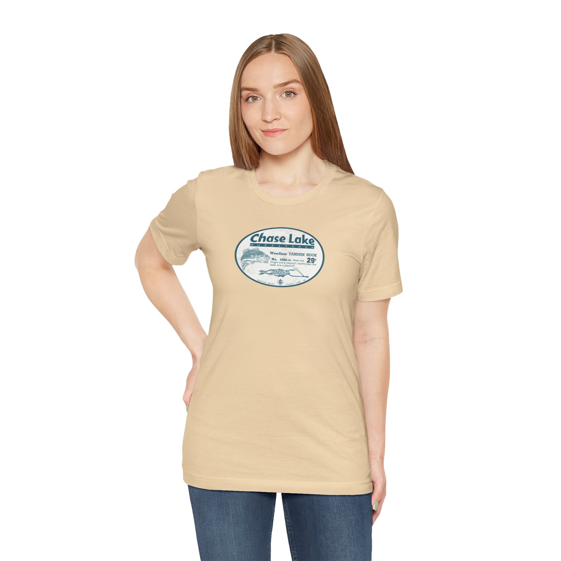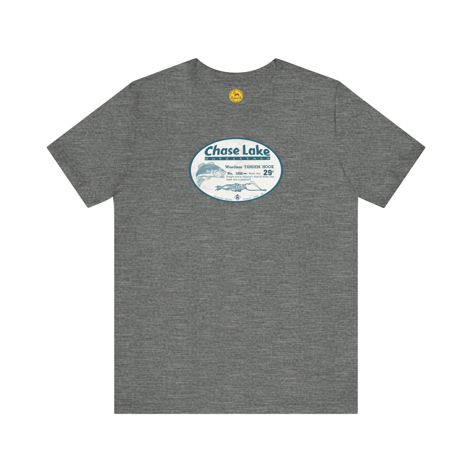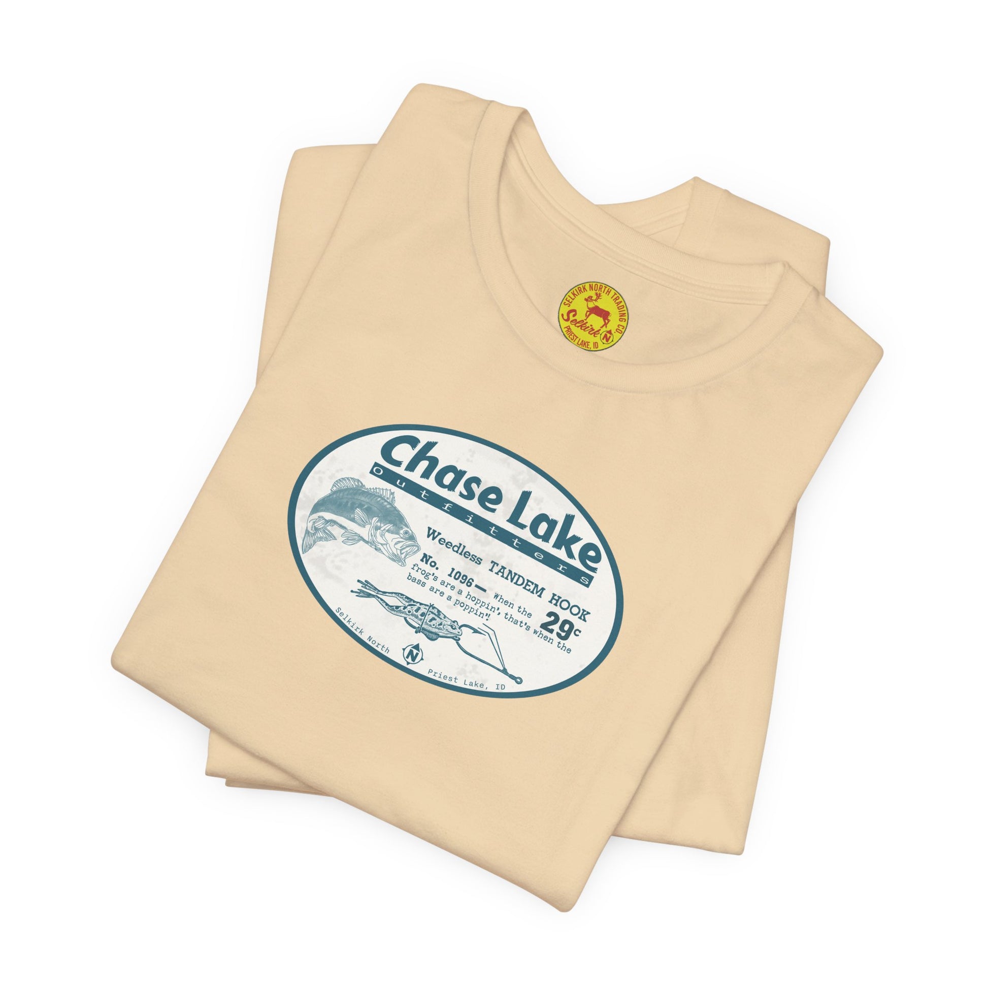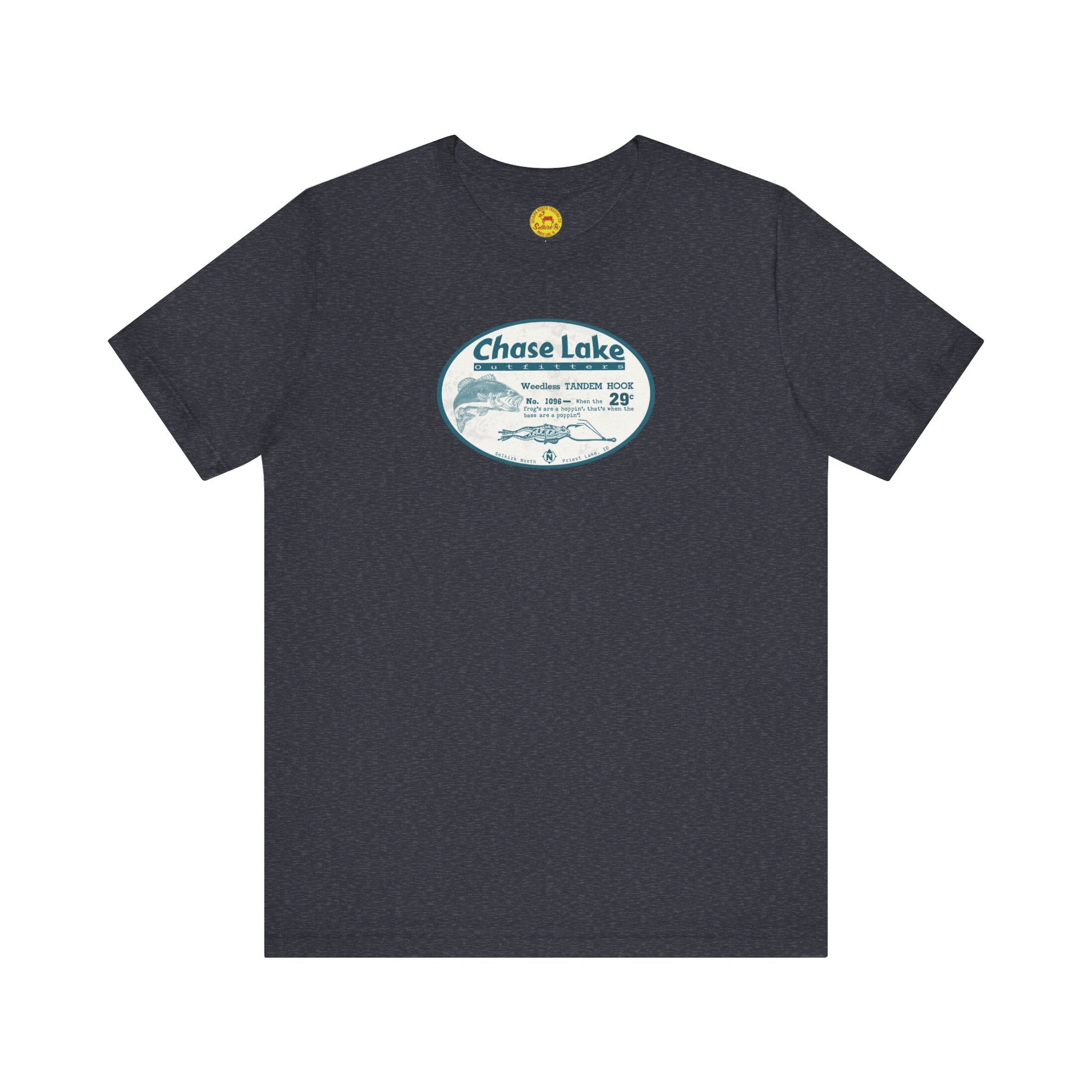 Way back when, in the 1980s, our founder spent almost every weekend during the summer, fishing for bass in Chase Lake with his father. Since then, a lot has changed around this area in general, so, of course, the landscape around Chase Lake has changed noticeably as well. One thing that hasn't changed, though, is that if you get out into the lily pads and start popping some frog lures (weedless hooks are a good idea), you're sure to get a stir out of the local bass population. This was a fun design to create, taking style cues from a circa 1941 sporting goods catalog. That 29¢ price point that you see? Yep, that's 1941 pricing!