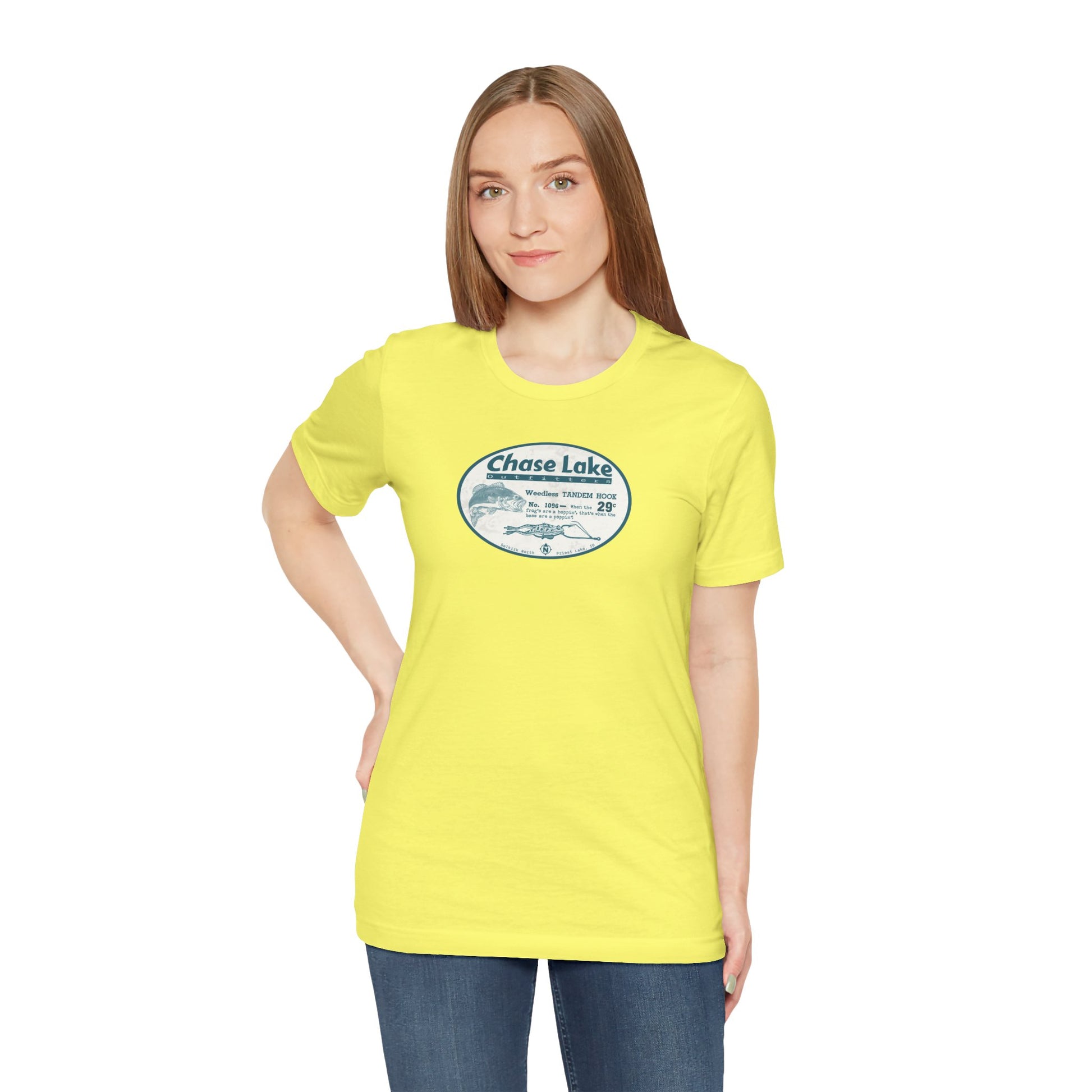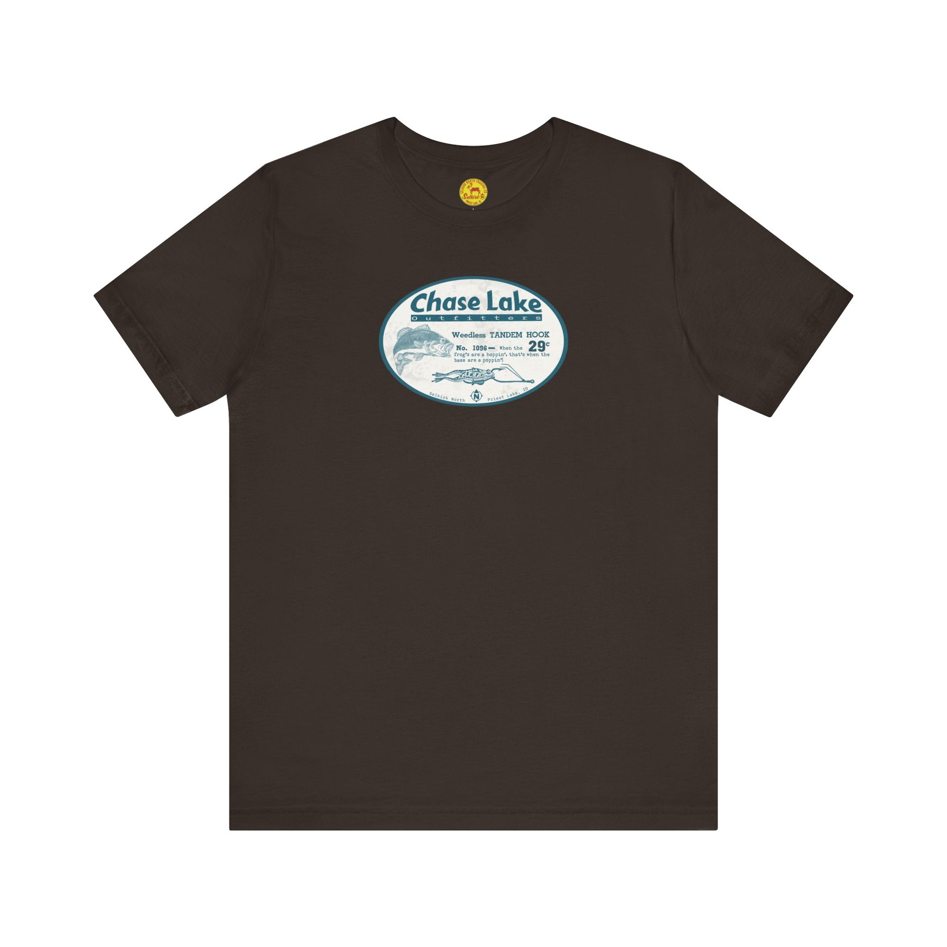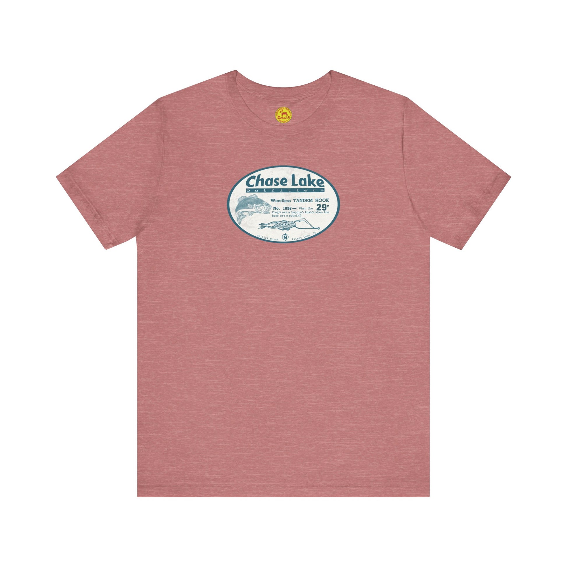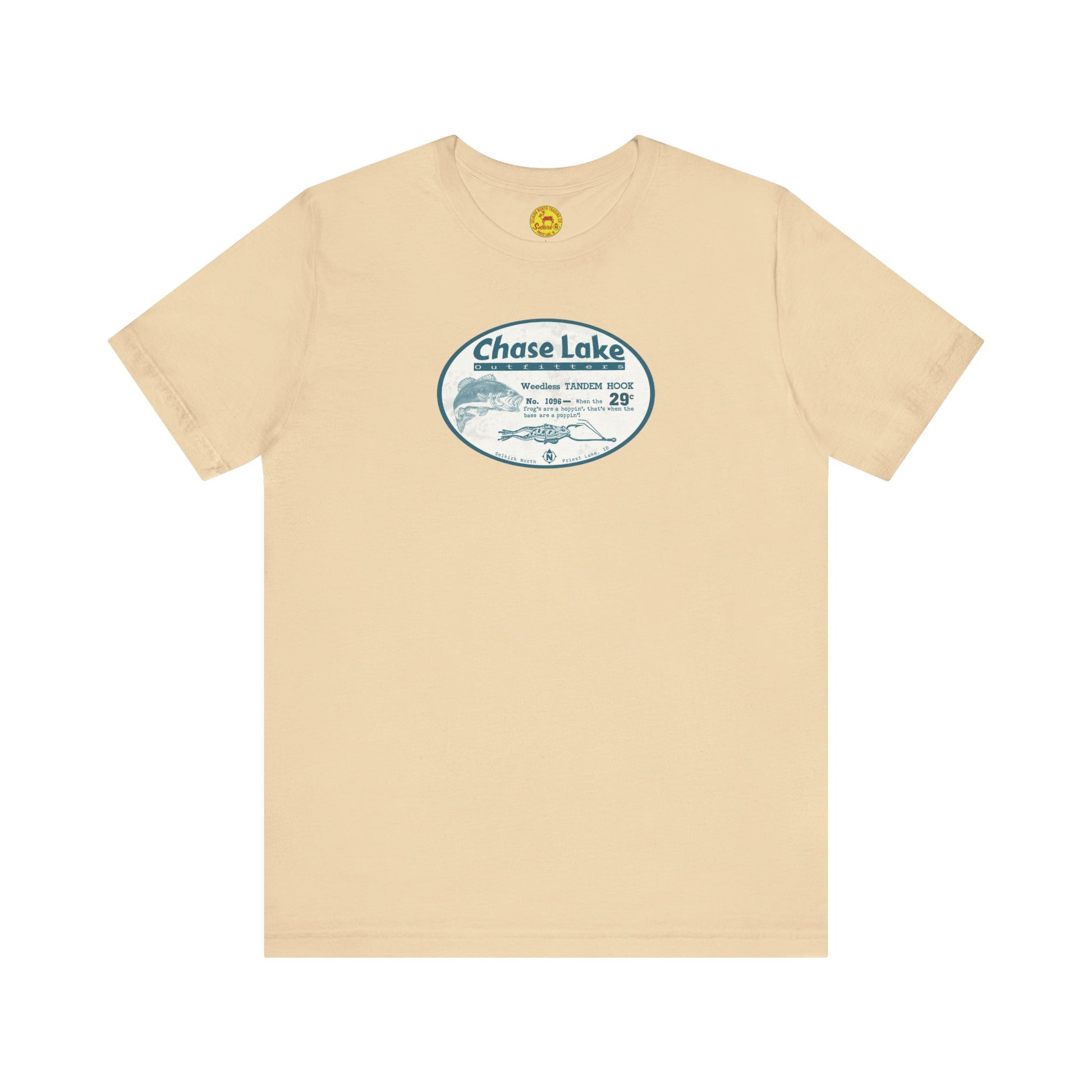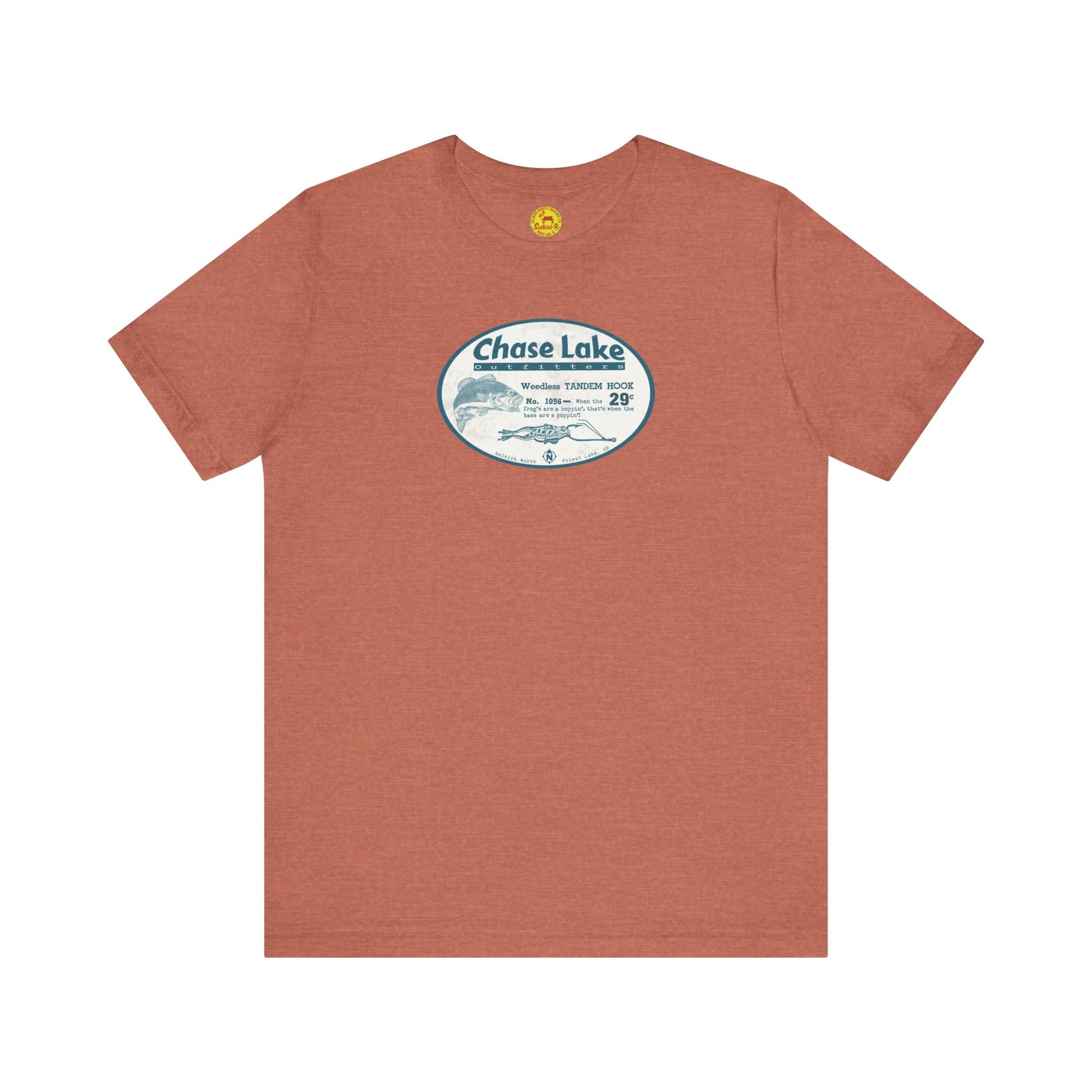 Way back when, in the 1980s, our founder spent almost every weekend during the summer, fishing for bass in Chase Lake with his father. Since then, a lot has changed around this area in general, so, of course, the landscape around Chase Lake has changed noticeably as well. One thing that hasn't changed, though, is that if you get out into the lily pads and start popping some frog lures (weedless hooks are a good idea), you're sure to get a stir out of the local bass population. This was a fun design to create, taking style cues from a circa 1941 sporting goods catalog. That 29¢ price point that you see? Yep, that's 1941 pricing!