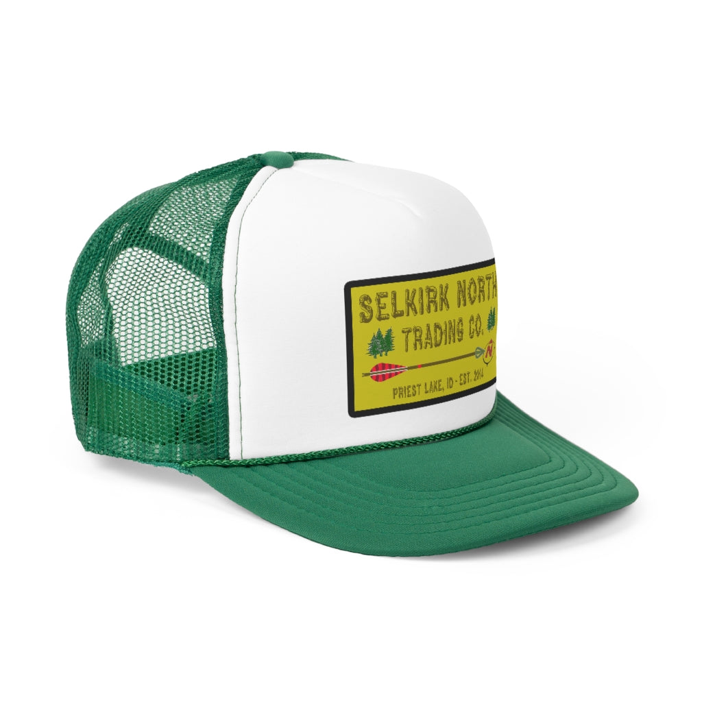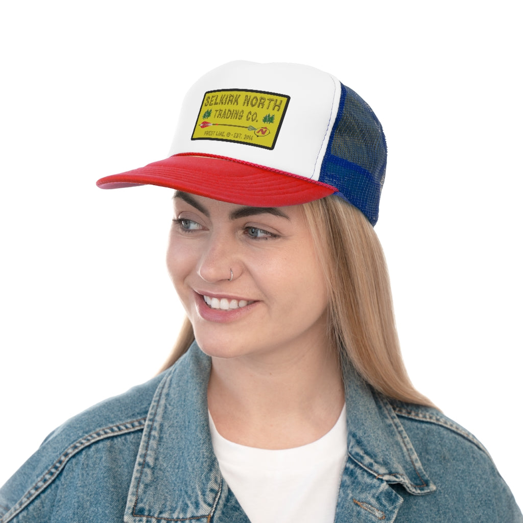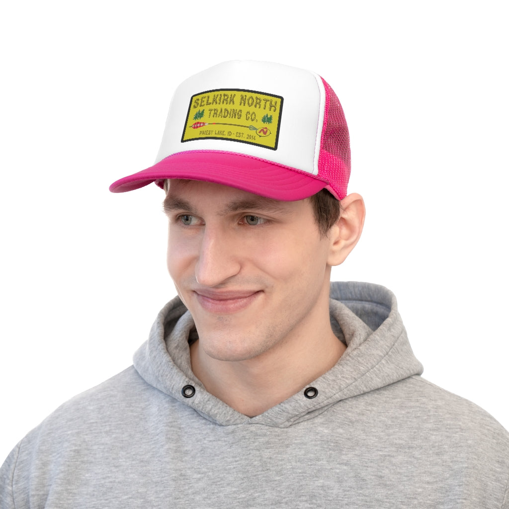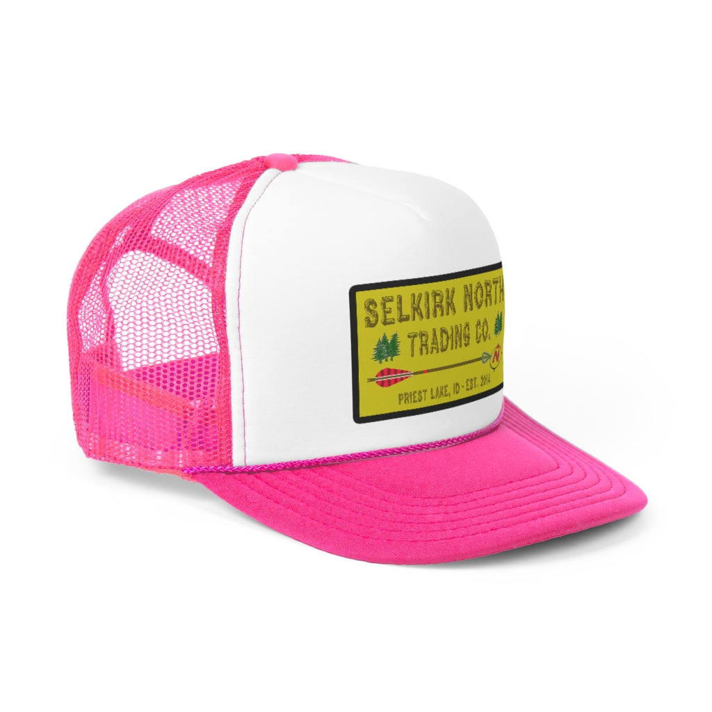 Trucker caps are perfect for almost any occasion. A 100% polyester front and 100% nylon mesh weave back make these hats super durable through regular wear and tear. They come in one size with an adjustable plastic snap closure: 22.8" (58cm). The cap's front has six rows of visor stitching. Pick any (or all) of the four-color variations and rep your Selkirk North with retro style!