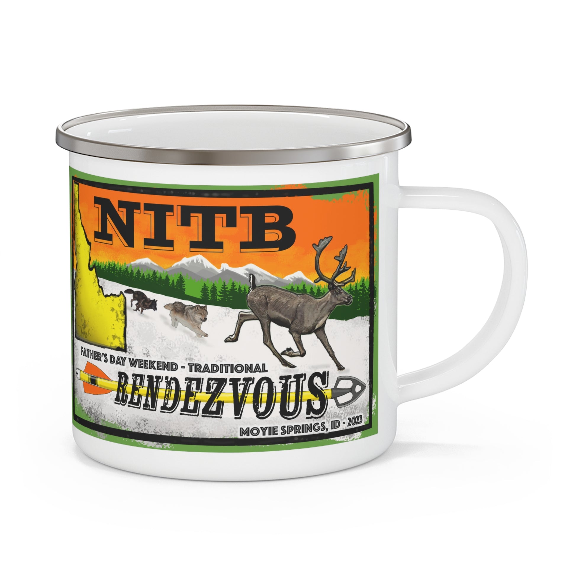 Regardless if you were able to attend the NITB 2023 rendezvous or not, you're sure to enjoy this beautiful camp cup. Featuring the official artwork of the 2023 rendezvous t-shirt that displays two iconic North Idaho species of wildlife; the Grey Wolf and Woodland Caribou.