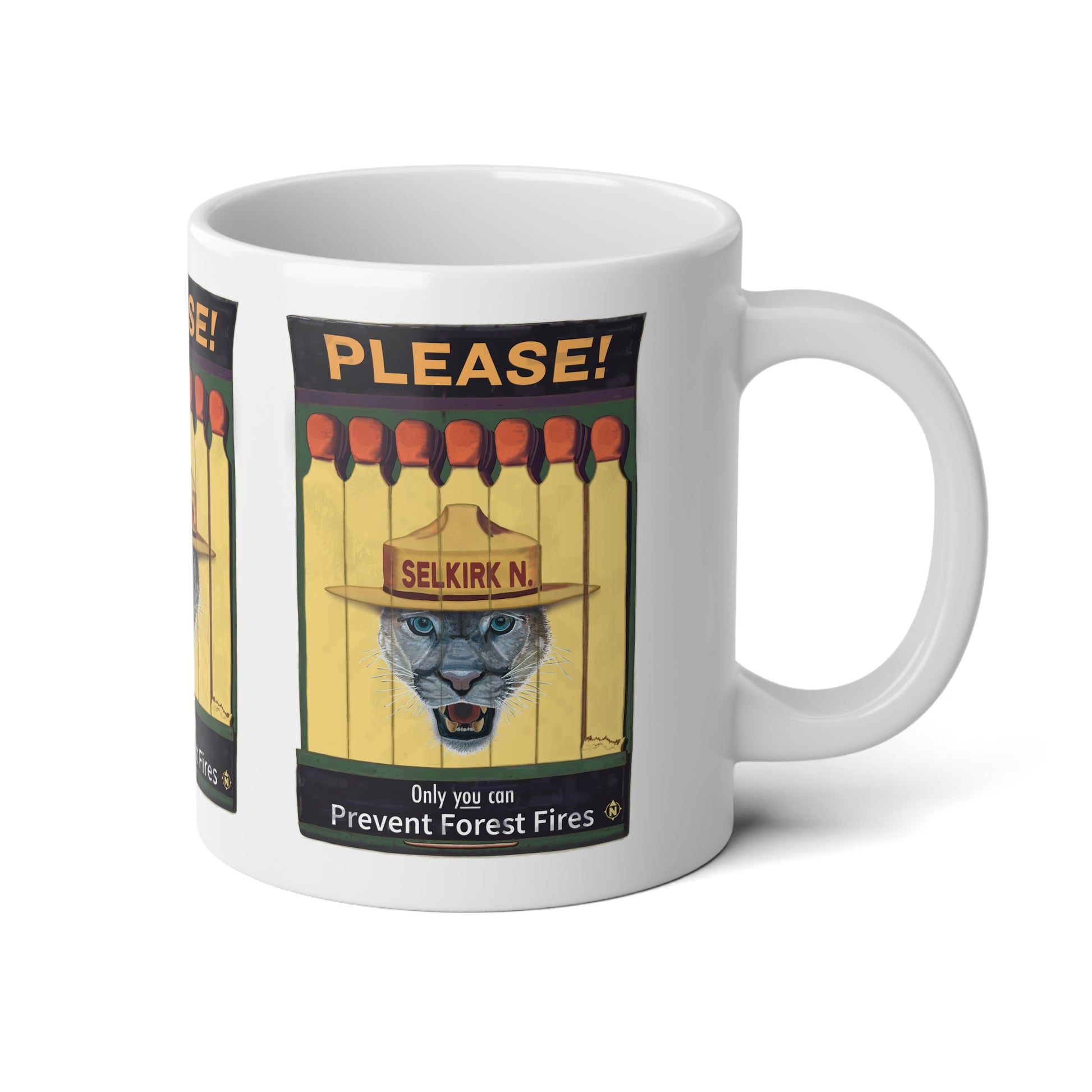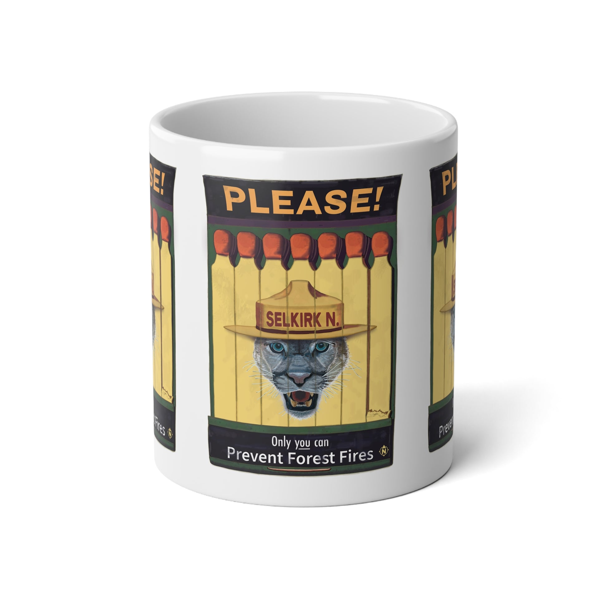 If you like vintage media, then you're gonna love our Selkirk Tommy matchbook design! Reminiscent of old PSAs from Smokey The Bear, we've done our best to capture the fun and campy vibes while sharing the classic message of "only you can prevent forest fires". This retro-inspired design wraps around the barrel of this full-grown adult-sized mug, making it sure to be your new favorite morning time companion.